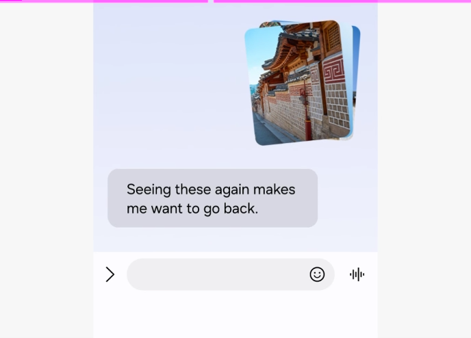 Благодаря технологии Galaxy AI, совершенно новая функция Now Nudge может распознавать контекст на вашем экране и предлагать вам полезные сочетания клавиш. Она интеллектуально сокращает количество действий для выполнения задачи и даже предлагает варианты автозаполнения. Находить фотографии и делиться ими стало еще проще. Если кто-то попросит фотографии из недавней поездки, Now Nudge поймет, какие снимки вам нужны, и найдет их для вас. Затем вы будете перенаправлены к этим конкретным фотографиям в Gallery, что позволит вам выбрать и отправить их всего в несколько касаний.