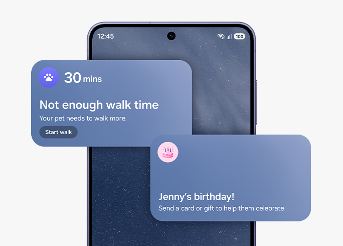 One UI 8.5 персонализирует ваш Galaxy в зависимости от того, как вы используете его ежедневно. Простые и интуитивные контекстные напоминания от Now Brief и интеллектуальные подсказки от новых функций Now Nudge и AI Select упрощают выполнение повседневных задач одним касанием.
